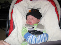 Jack is getting out more and more often– everyday we go somewhere, usually with a bit of a drive. He gets out of his carrier and back into it, has been changed and fed on the road. We’re trying to ramp him up for next month when mom goes back to work and Jack travels several times a day to take his sisters to and from school. Although he gets cranky about the confinement after a while, he’s becoming a good back seat driver.